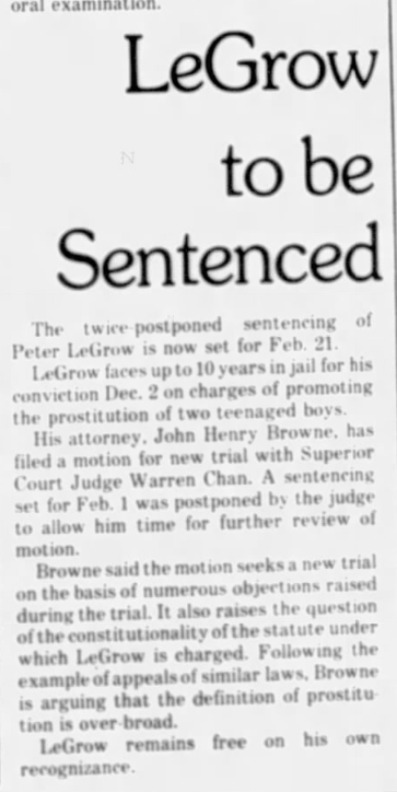 A newspaper article about the sentencing of Peter LeGrow, who was a client of John Henry Browne that was published in The Seattle Gay News on February 17, 1978.