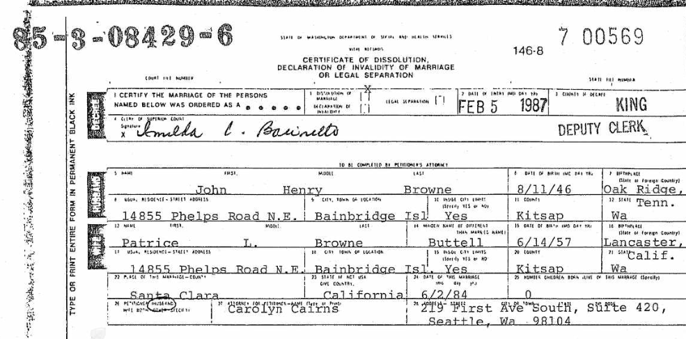John Henry Browne and Patrice’s divorce certificate that was filed on February 5, 1987.