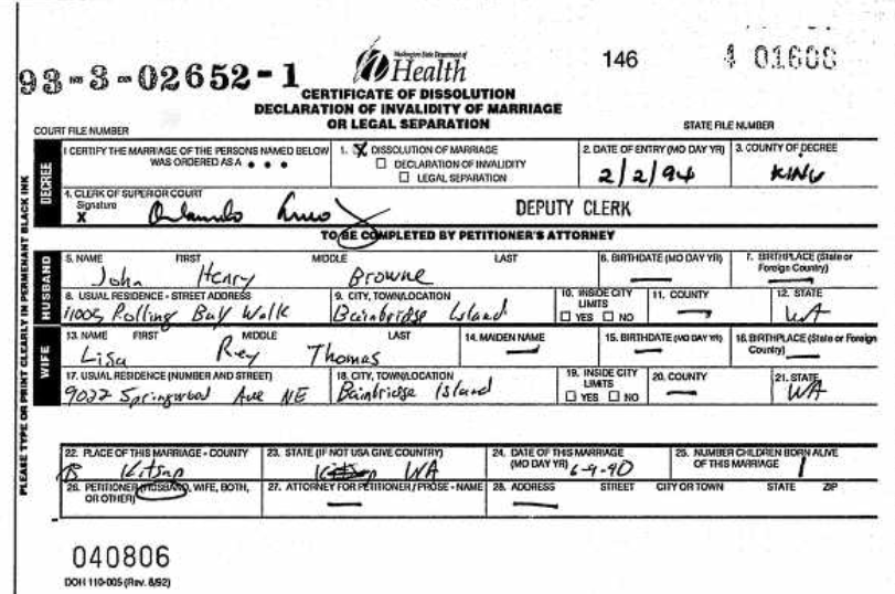 John Henry Browne and Lisa Ray Thomas’ divorce certificate that was filed on February 2, 1994.