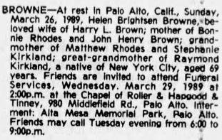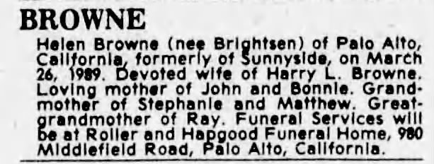 The obituary for Helen Brightsen-Browne published in The Peninsula Times Tribune on March 28, 1989.