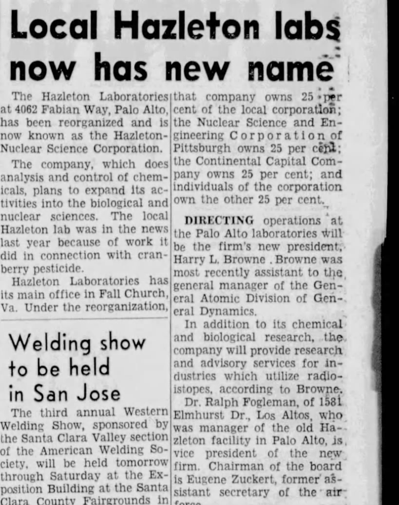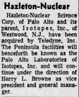 A newspaper article about Hazleton Nuclear Science Corp that mentions Harry Browne that was published in The San Francisco Chronicle on April 7, 1967.