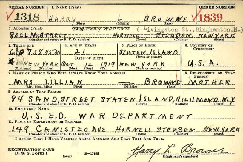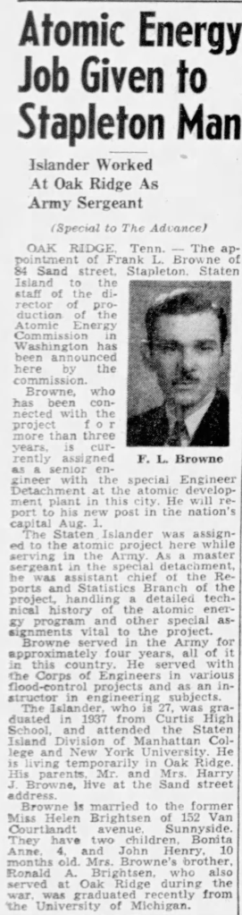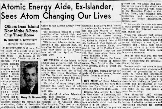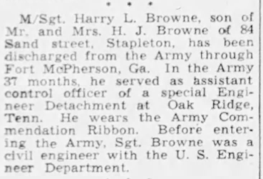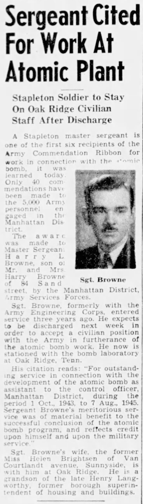 A newspaper clipping about Harry Browne that was published in The Staten Island Advance on March 26, 1946.