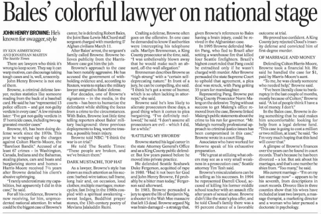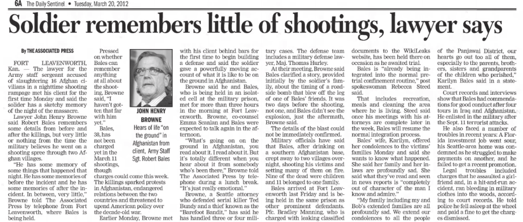 An article about Sergeant Robert Bales. that mentions John Henry Browne published in The Olympian on April 9, 2012.
