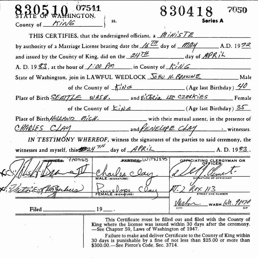John and Victoria Lee Czerkies marriage certificate that was filed on April 24, 1983 in Seattle.