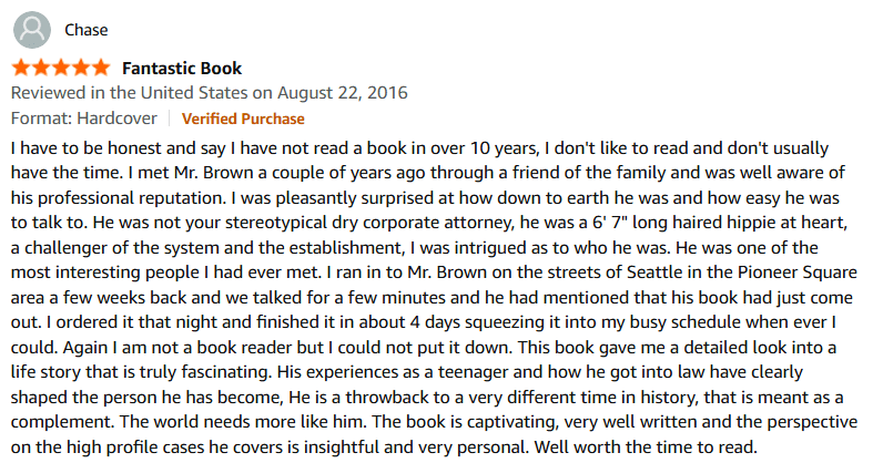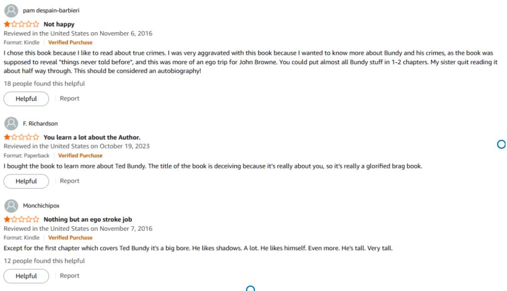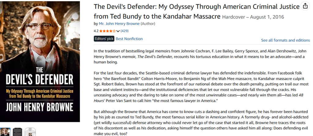 Some of the lower ranked reviews of John Henry Browne’s 2016 book, ‘The Devil’s Defender: My Odyssey Through American Criminal Justice from Ted Bundy to the Kandahar Massacre.’