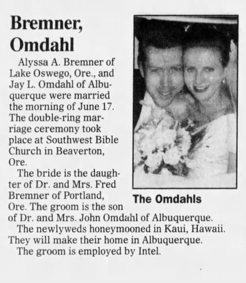 A newspaper clipping about Anne Bremner getting married to Jay L. Omdahl that was published in The Albuquerque Journal on August 5, 1995