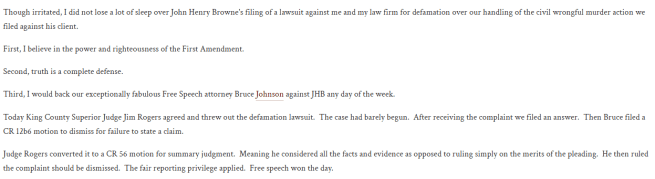 A screenshot from Karen Koehler, The Velvet Hammer: Judge tosses out John Henry Browne’s lawsuit against me published on November 19, 2016.