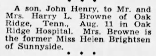 Background: John Henry Browne was born on August 11, 1946 to Harry and Helen Browne in Oak Ridge, TN. Harry L. Browne Jr. was born on October 12, 1919 in Staten Island and Helen Margaret Brightsen was born on June 16, 1919 in New York. Upon returning home from the Army during WWII (he enlisted on January 1, 1939) the high school sweethearts got married on January 24, 1942 in NYC, and the couple went on to have two children together: Bonita (or Bonnie, b. June 1944) and John. While his wife was still in the hospital recovering from giving birth to their daughter, Harry got a call from Colonel James C. Marshall, who was the military lead on a new governmentally funded engineering program: he wanted the new father to come work for him on a new project. Harry said yes, and the young family packed up their home in New York and moved to Oak Ridge, TN.