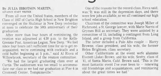 A newspaper article about John and Helen Browne’s high school reunion that mentions them by name that was published in The Staten Island Advance on September 27, 1987.