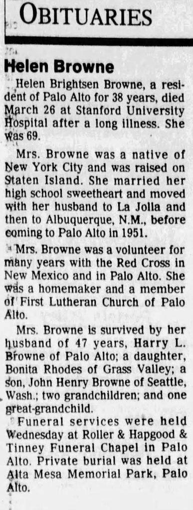 Conclusion: Helen Brightsen-Browne died at the age of sixty-nine after succumbing to a long illness on March 26, 1989. According to her obituary, she was a homemaker and volunteered with the American Red Cross for many years; she was also a member of the First Lutheran Church of Palo Alto. At the time of her death her and Harry had been married for forty-seven years. John’s father Harry L. Browne died on Valentine’s Day in 2015 at the age of ninety-five, and his sister Bonnie passed away at the age of seventy-one on July 24, 2013 in Sacramento, California.