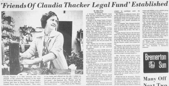 A newspaper article about a legal fund hat was set up to help support one-time JHB client Claudia Thacker that was published in The Kitsap Sun on December 22, 1977.