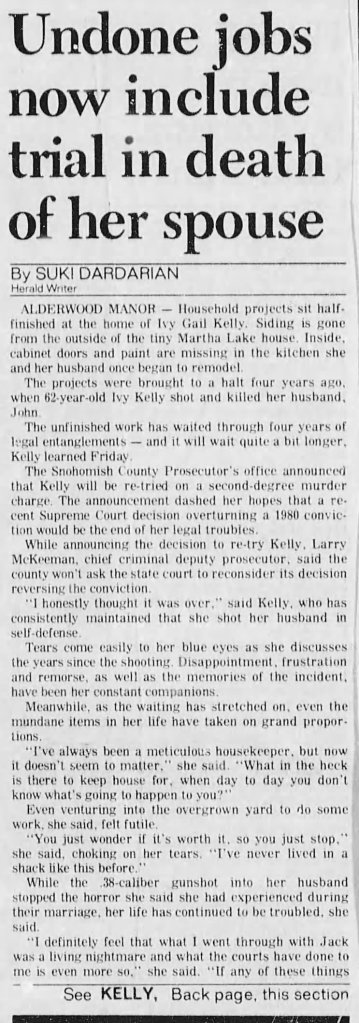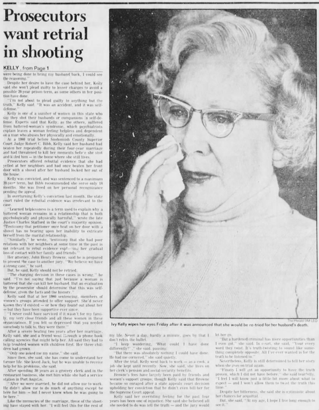 Ivy was found guilty of second-degree murder by a jury of her peers and was sentenced to a maximum term of twenty years in prison; she appealed the verdict, claiming she lived through ‘years of ‘extensive previous physical abuse at the hands of her husband,’ and during the proceedings was represented by John Henry Browne. The attorney presented arguments for self-defense based on his client’s history of being an abused spouse and called in a recognized expert in the field of battered women, who testified the incident ‘fit the classic behavioral model of a batterer’ and that Kelly was ‘a victim of the battered woman syndrome.’ The jury eventually acquitted her.