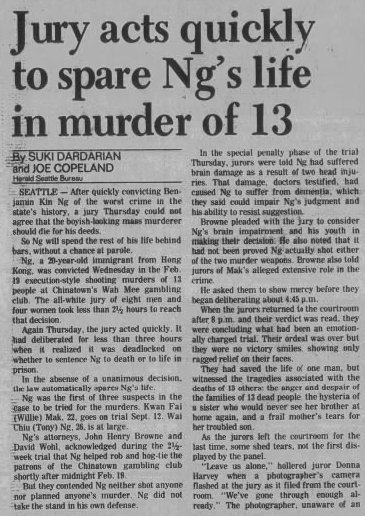 Benjamin Ng: John Henry Browne also represented Benjamin Ng, who was a part of the 1983 Wah Mee Massacre, which (as of April 2026) is classified as the deadliest mass shooting in Washington state history. On February 18, 1983 three men bound and robbed fourteen people at the Wah Mee Club (an illegal gambling den located in Seattle’s Chinatown district), then opened fire on them, killing thirteen of them; one victim (Wai Chin) survived and testified against them. In addition to Ng two other men were charged for the brutal crime: Kwan Fai ‘Willie’ Mak and Wai-Chiu’ ‘Tony’ Ng.