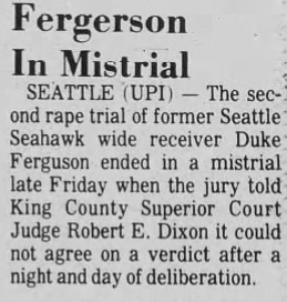 Duke Fergerson: A former Seattle Seahawk, Duke Fergerson was charged with raping two young women at an apartment complex, and he was arrested on October 23, 1979; Browne represented him in court, and by late 1980 he acquitted of all charges. The case gained additional attention after Jodi Zimbelman, a Seahawks ticket office employee who had previously dated Fergerson, filed a discrimination lawsuit against the team claiming she had been fired because of her interracial relationship with the football player; the team maintained Zimbelman was fired for violating a rule against dating other employees.