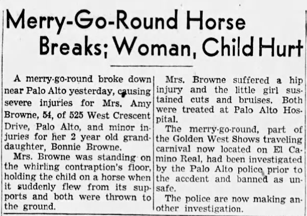 A newspaper clipping that mentions Johns’ sister Bonnie being hurt on a merry-go-round ride that was published The San Francisco Examiner on January 28, 1946.