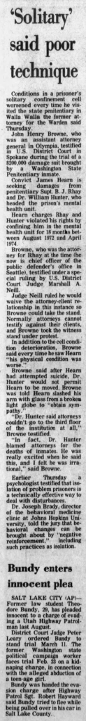 An article about a case John Henry Browne was trying that happened to have an article about Ted Bundy immediately following it that was published in The Spokesman-Review on February 6, 1976.