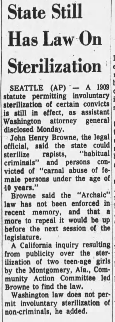 A newspaper article about a WA state sterilization law that mentions John Henry Browne that was published in The Kitsap Sun on July 10, 1973.