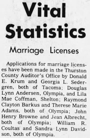 A newspaper clipping announcing John and his first wife receiving their marriage license published in The Olympian on February 11, 1973.