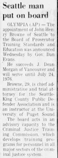A clipping mentioning John Henry Browne being appointed to the Board of Prosecutor Training Standards and Education that was published in The Spokane Chronicle on December 11, 1975.