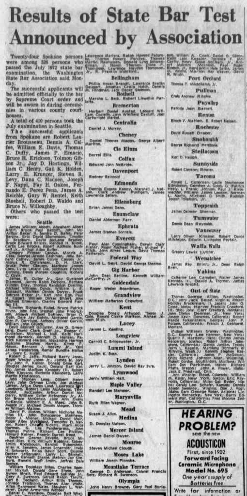 John’s name in a list of people that passed the WA state bar exam that was published in The Spokesman-Review on October 3, 1972.