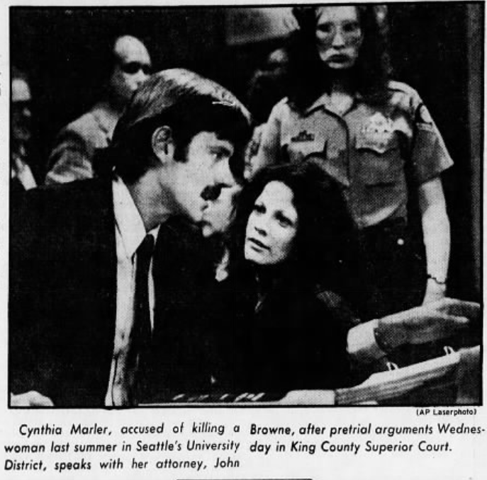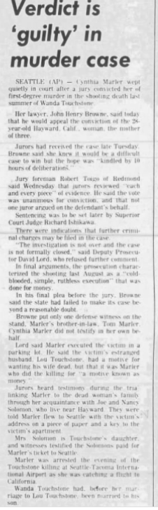 Cynthia Marler: on August 11, 1980, Cynthia Marler was arrested and charged with the murder of Wanda Touchstone, a Polish immigrant that had recently separated from her husband. She hired Browne to defended her against charges that she was a ‘cold blooded killer that hired someone to kill Lou Touchstone’s wife,’ and during her trial it was argued that she was a hired ‘assassin’ that traveled from Bay Area (where she lived) to kill Touchistone; in response to this, JHB argued that it was actually the victim’s husband who had the real motive and ‘he held a great hammer over her head.’ She was ultimately convicted of the murder but appealed her conviction in 1982; the original ruling was upheld.
