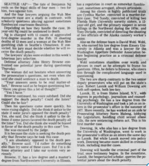 An article about John Henry Browne’s time trying defendant Benjamin Ng that was published in The Tri-City Herald on August 13, 1983.