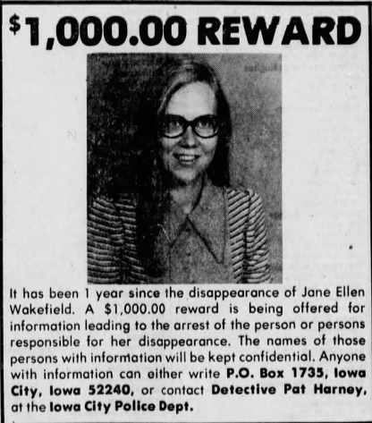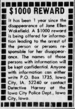An newspaper advertisement for a reward for any information that leads to the arrest of the person that is responsible for the disappearance of Jane Wakefield that was published in The Iowa City Press-Citizen on October 29, 1976.