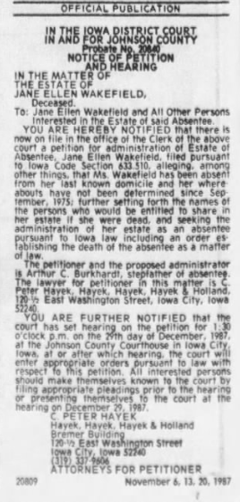 A clipping about the estate of Jane Wakefield in relation to her disappearance that was published in The Iowa City Press-Citizen on November 20, 1987.
