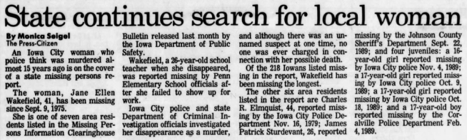 An article about the continued search for Jane Wakefield that was published in The Iowa City Press-Citizen on January 25, 1990.