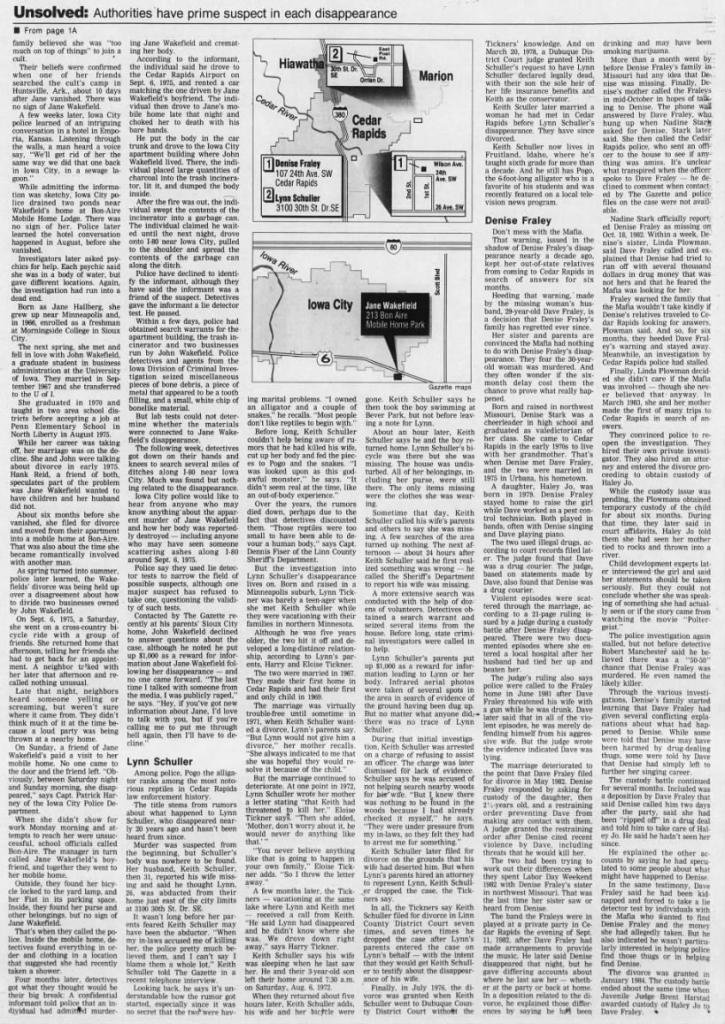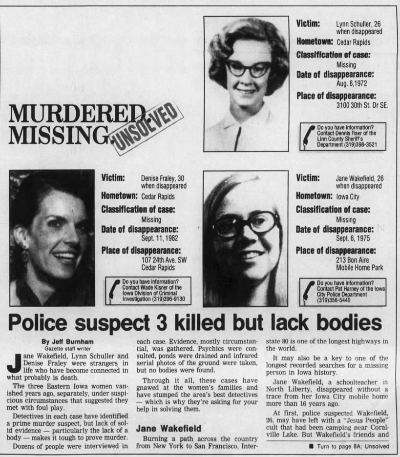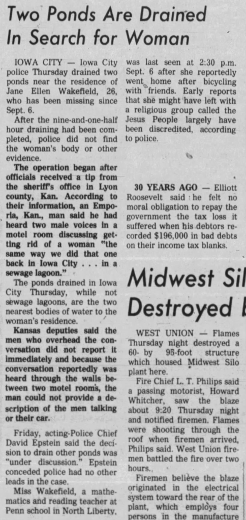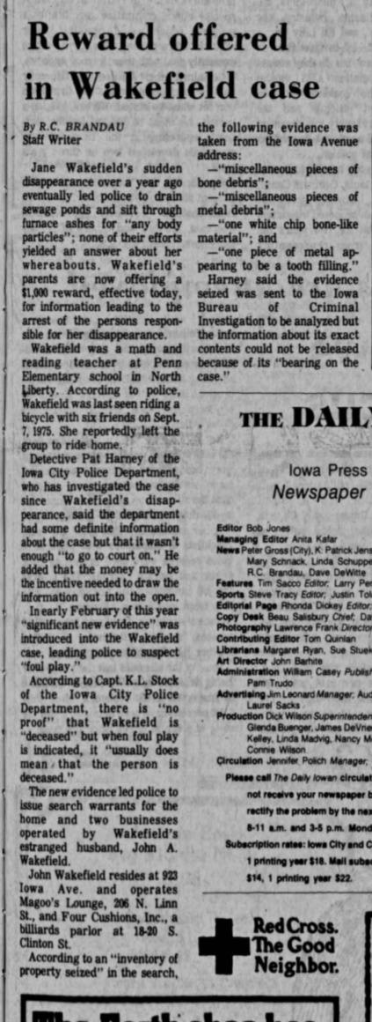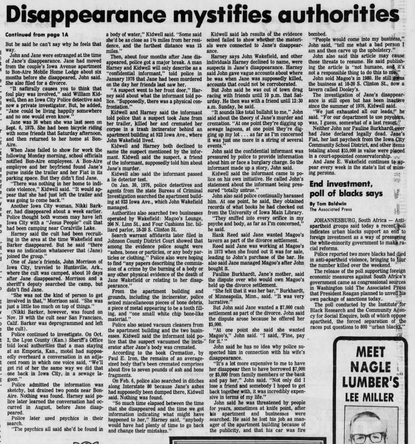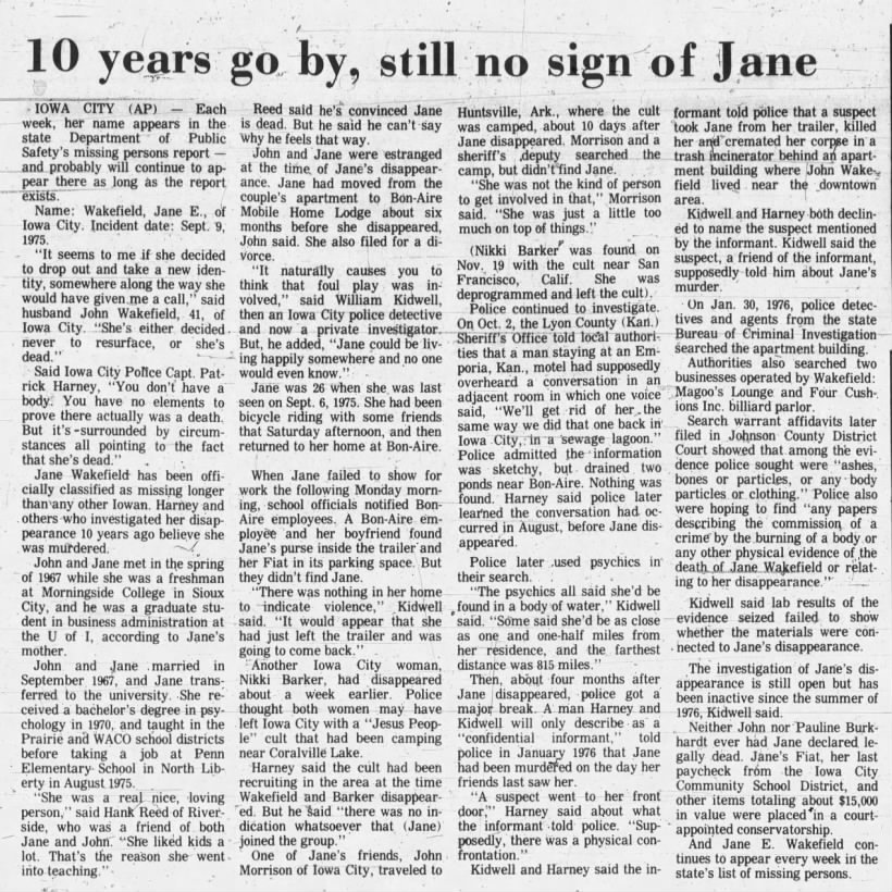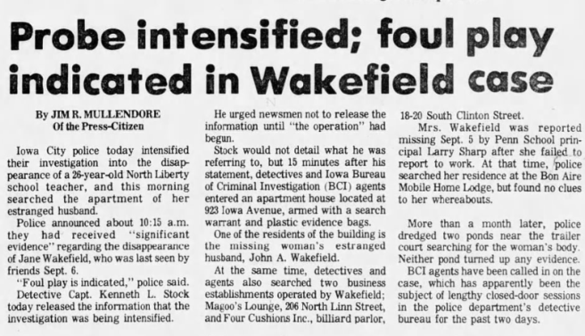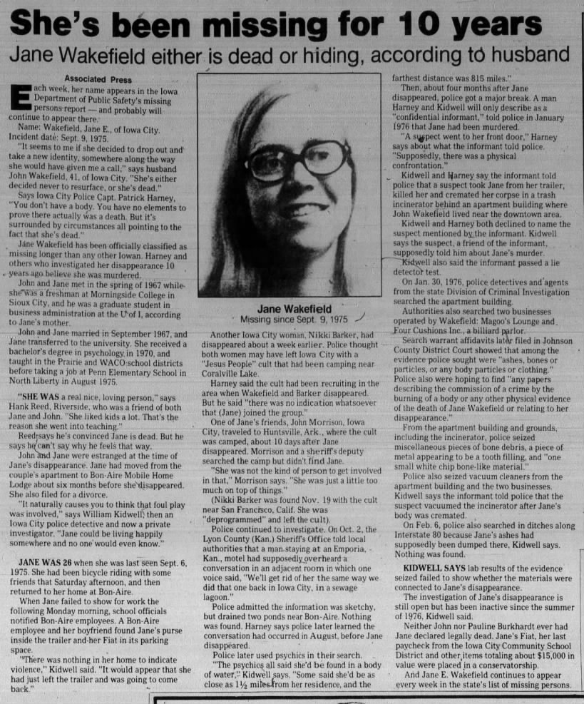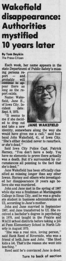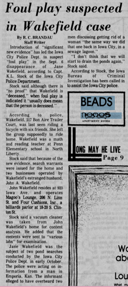 Part two of an article about the disappearance of Jane Wakefield that was published in The Iowa City Press-Citizen on September 9, 1985.