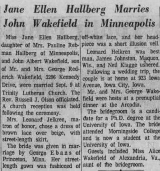 Marriage: in 1966, Jane got a job at Sioux City’s Public Museum, and in the spring of 1967 she met John Wakefield through a co-worker, who was a graduate student in business administration at the University of Iowa. After she completed her freshman year in the spring 1967, she moved in with John for the summer, and the two were married on September 9, 1967 in the Trinity Lutheran Church in Minneapolis. I’m assuming Jane had some sort of falling out with her father as he wasn’t mentioned in her wedding announcement at all and she was given way by a man named ‘George Ebans.’ For her wedding ceremony, Jane wore a ‘street-length gown’ that was fashioned of ‘off-white lace,’ and her head piece was a short illusion veil.’ At the time of their wedding John Wakefield was a PhD candidate at the University of Iowa, and the bride attended Morningside College before she transferred to the same school as John.