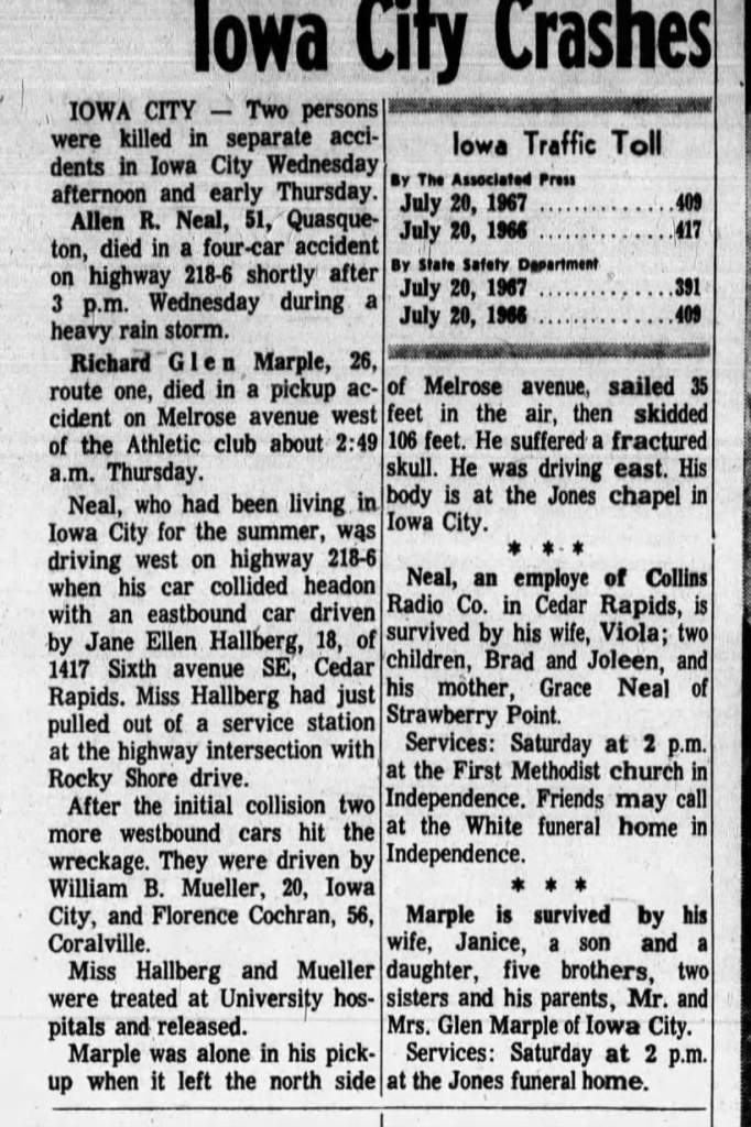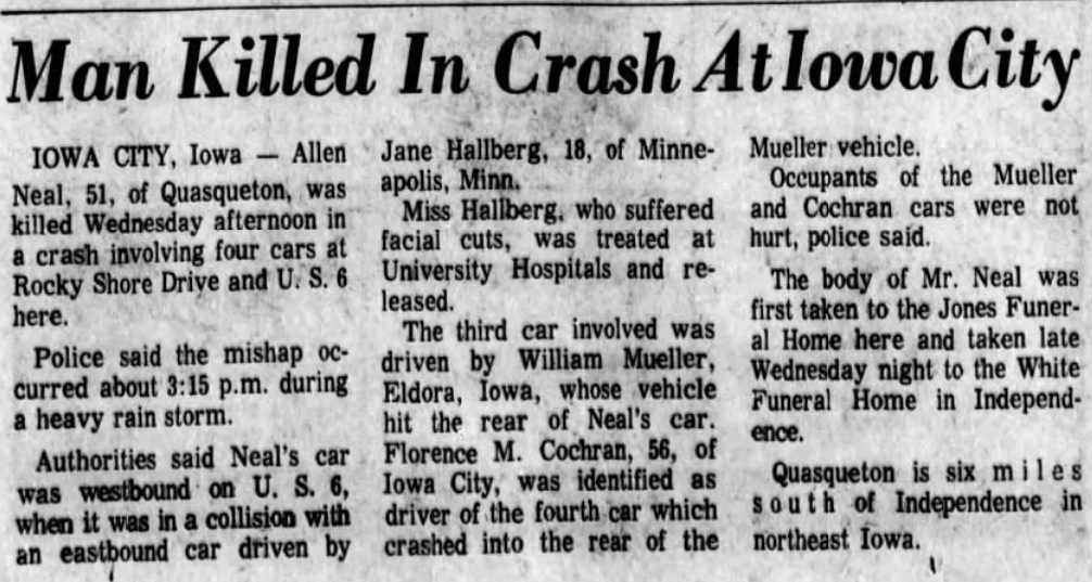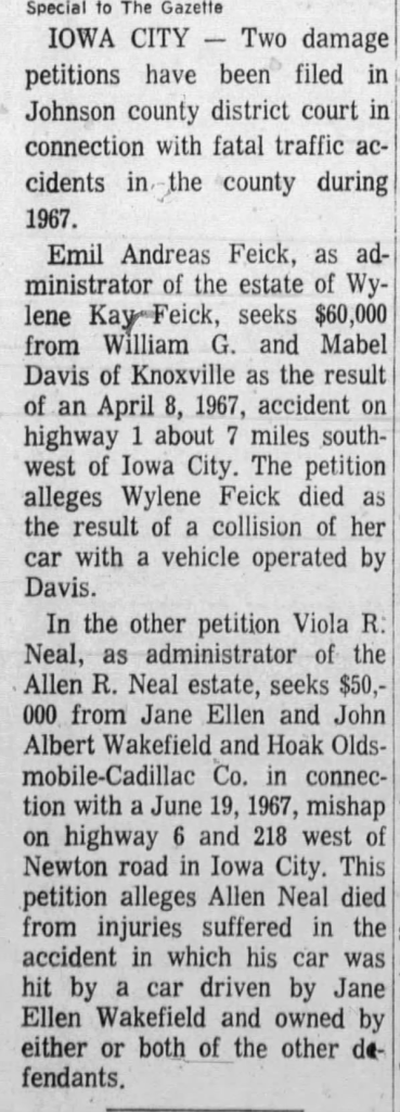 Car Accident: around 2:30 PM on July 19, 1967, Jane was involved in a fatal accident after she pulled out of a service station at an intersection on Rocky Shore Drive during a heavy rainstorm: fifty-one-year-old Allen R. Neal died as a result of the injuries he sustained from the accident. Neal was employed at the Collins Radio Company in Cedar Rapids and had a wife (Viola) and two children (Brad and Joleen).  In October 1968 his widow sued the Wakefield’s along with Hoak Oldsmobile-Cadillac Company for $50,000, claiming her husband died from injuries he suffered from the car accident Jane caused (I couldn’t find the resolution of the case).
