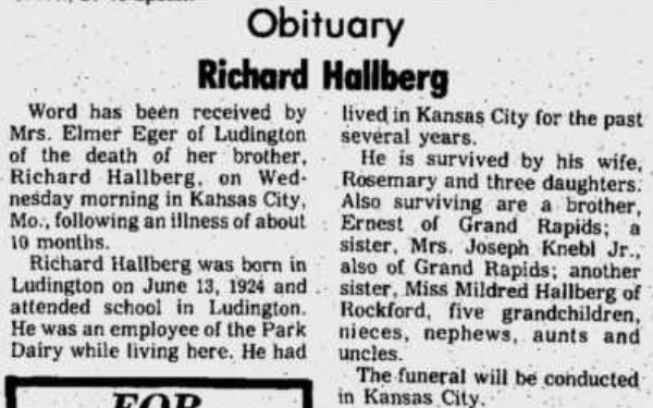 Richard Hallberg’s obituary that was published in The Ludington Daily News on October 2, 1975.