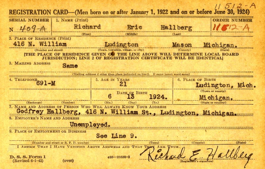 Richard Hallburg’s WWII draft card.