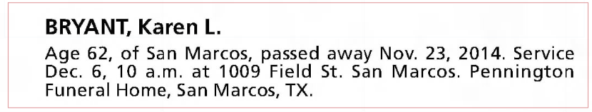 Karen Bryant’s obituary from The Austin American-Statesman on November 30, 2014.