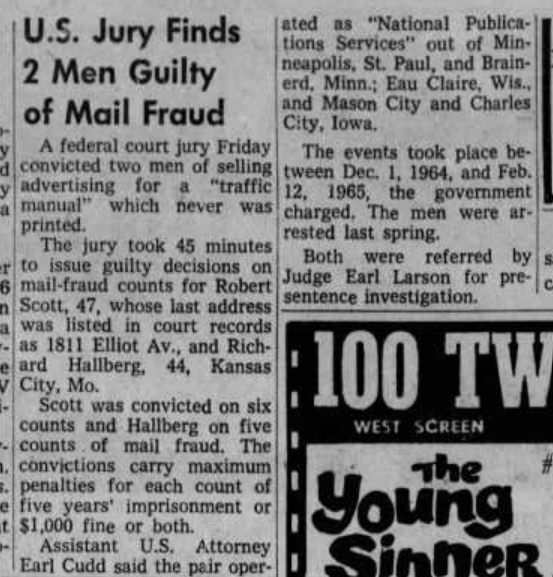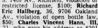 A clipping that mentions Richard Hallberg being fined $50 for being in violation of the open bottle law that was published in The Minneapolis Star on January 5, 1961.