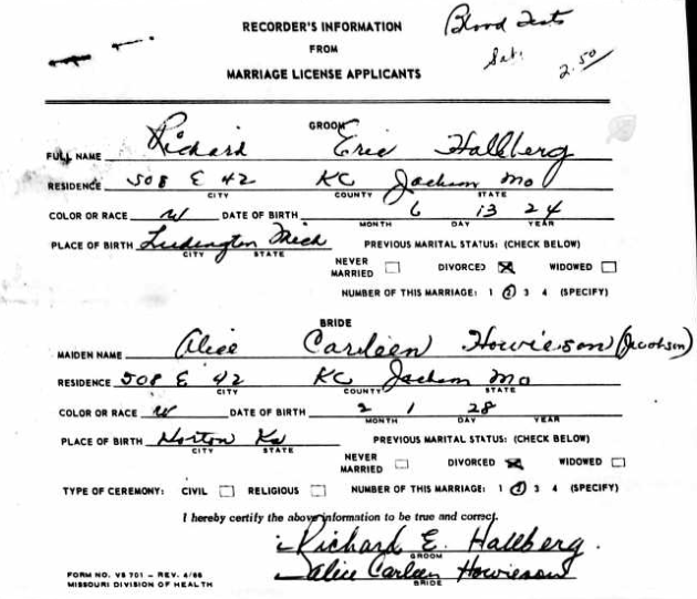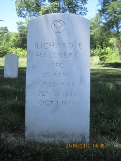Richard Eric Hallberg died at the age of fifty-one on October 1, 1975 in Kansas City, Missouri. According to his obituary, he attended school in Ludington, MI and was an employee of the Park Dairy while he lived there; before his death he lived in Kansas City and it’s worth noting that none of his daughters are listed by name in the write-up. His wife Vicki Irene Hallberg died at the age of forty-nine on May 10, 1977 and she is buried next to him in Fort Leavenworth National Cemetery in Kansas (even though his obituary said he was married to a woman named ‘Rosemary’ at the time of his death).