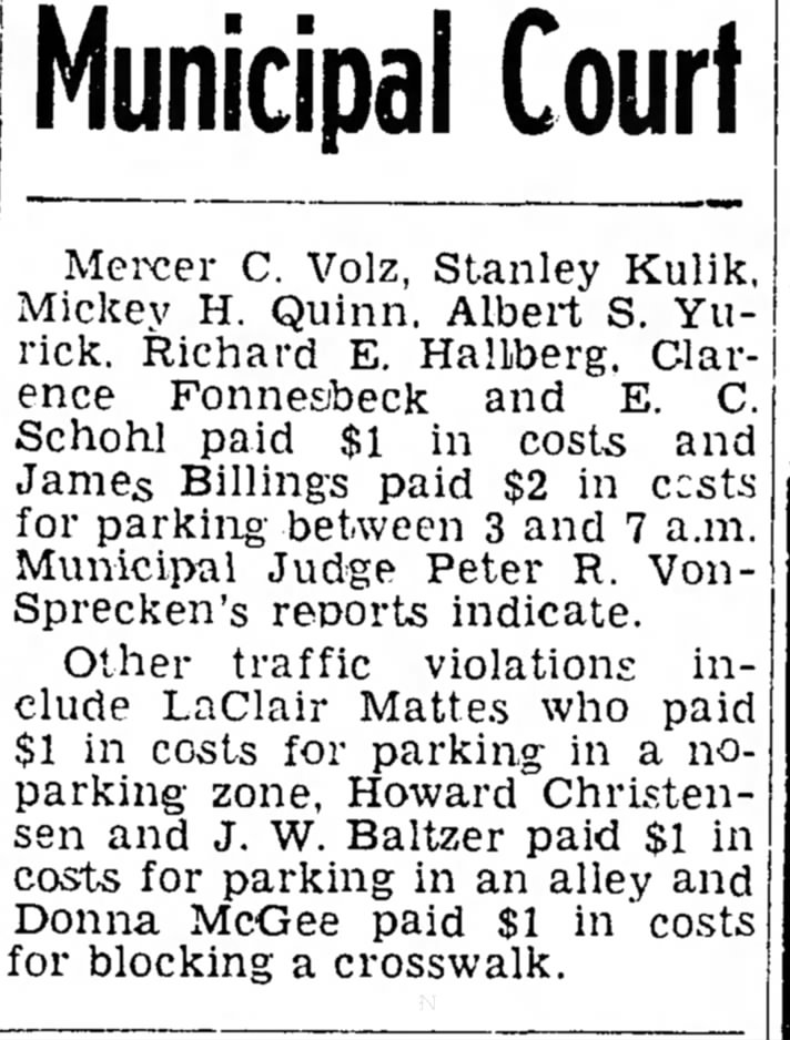 A clipping that mentions Richard Hallberg paying a fine related to aa parking infraction that was published in The Ludington Daily News on December 24, 1949.