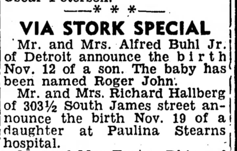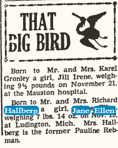 Jane’s birth announcement that was published in The Ludington Daily News on November 20, 1948.