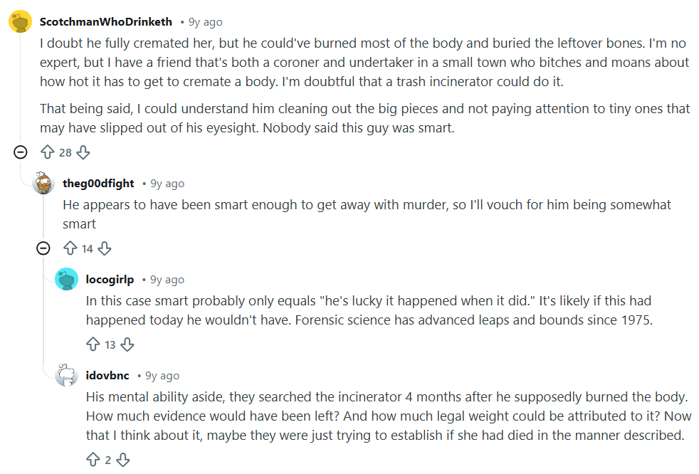 A Break: four months after Jane disappeared, detectives got their first major break in the case when a Confidential Informant (who happened to be a friend of her husband, who was the main suspect) told investigators that John had killed his estranged wife, cremated her body in an industrial-scale incinerator behind the apartment building he owned (and lived in), then spread her ashes along a ditch on the Interstate-80 (one report said it was the I-40) just outside of Iowa City in the middle of the night (he actually deposited the majority of them in a rest stop garbage can). Wakefield had access to this piece of equipment thanks to one of his business endeavors, something that he and Jane were actively trying to figure out how to split up during their divorce. He had even gone so far as to shift the blame on her new boyfriend, and on September 6, 1975 had rented a car from the Cedar Rapids Airport that was a near match to the one driven by her new bf then drove to her residence late that night and choked her to death. He then put her in the trunk and drove it to his Iowa City apartment building.