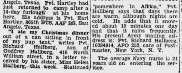 A newspaper clipping mentioning Richard Hallberg that was published in The Ludington Daily News on January 23, 1943.