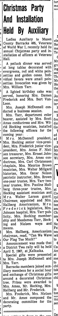 A newspaper article that mentions Pauline Hallberg helping out in her local Ladies Auxiliary group that was published in The Ludington Daily News on December 21, 1966.