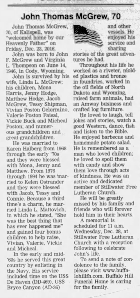 The Obituary for John Thomas (Jane’s sister Karen’s husband) that was published in The Daily Inter Lake on December 25, 2016.