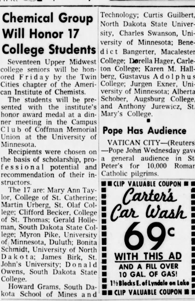 An article mentioning Karen M. Hallberg that was published in The Star Tribune on May 16, 1963.