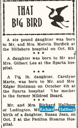 Susan Hallberg’s birth announcement that was published in The Elroy Leader Tribune on October 11, 1946.