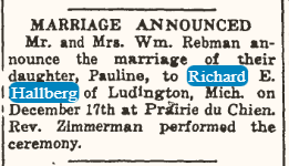 A newspaper clipping announcing the marriage of Richard Hallberg and Pauline Rebman that was published in The Elroy Leader Tribune on December 21, 1945.