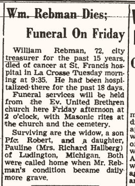 A newspaper article about Pauline’s father’s death that was published in The Elroy Leader Tribune on May 13, 1949.