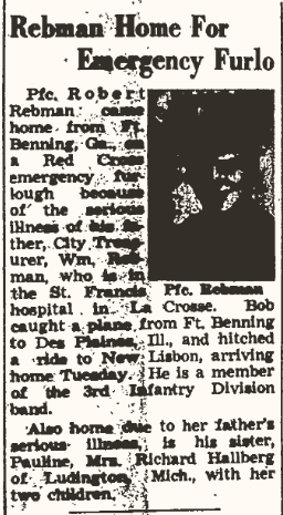 A newspaper article about Pauline’s brothers return home for an emergency furlo that was published in The Elroy Leader Tribune on May 6, 1949.