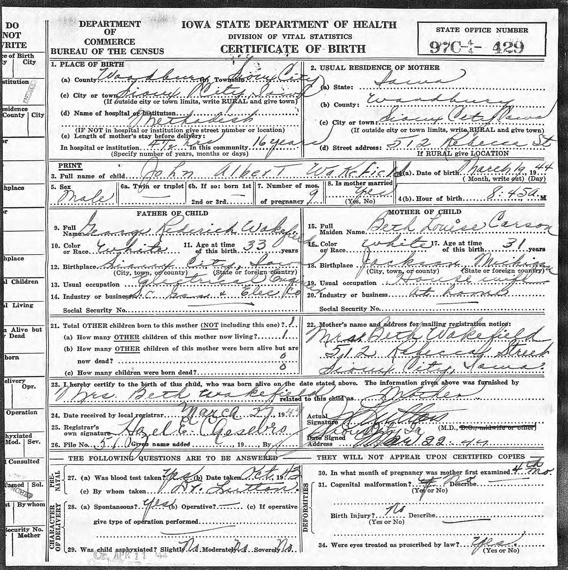 John A. Wakefield’s birth certificate.