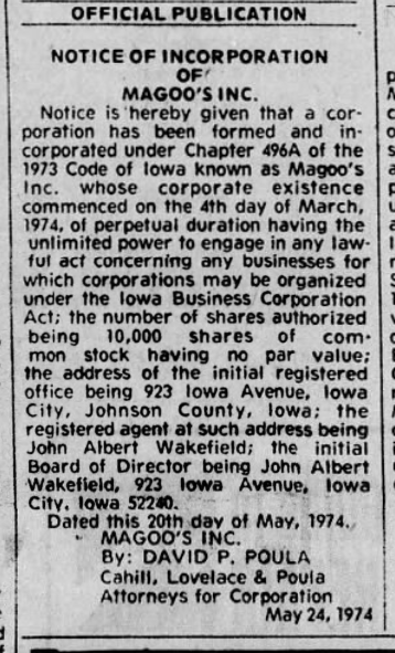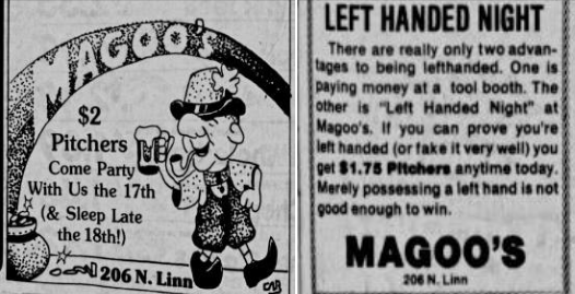 Two newspaper advertisements for Magoo’s courtesy of the ‘Fans of Magoo’s Bar in Iowa City’ Facebook page.